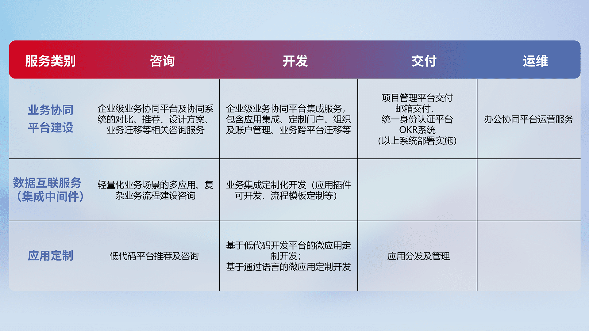 针对钉钉、、企微、、、IDaas等平台级产品提供产品的规划、、、、方案、、、、交付、、、、定制化开发等服务,,,实现如统一协同办公、、智能客户服务、、混合会议管理、、、、智能数据查询、、、等业务场景,,,实现数字化转型。。